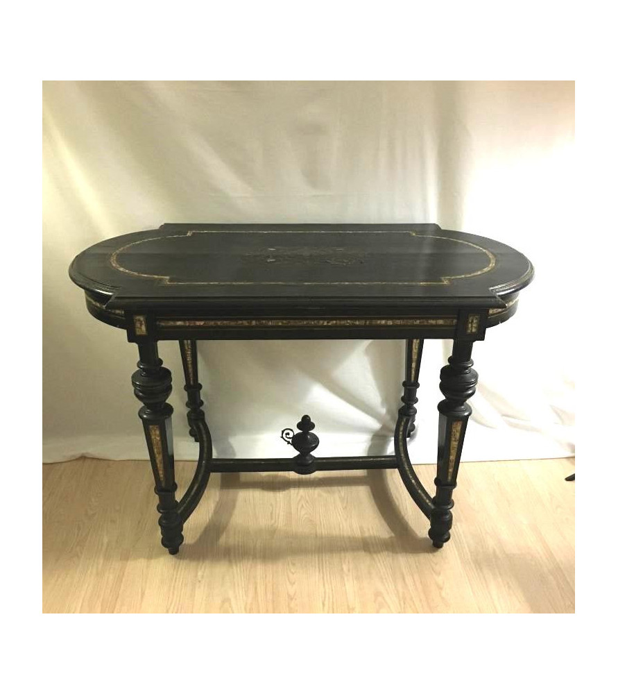 Belle table de milieu "Napoléon III" en bois noirci à décor de frises de nacre et de laiton.